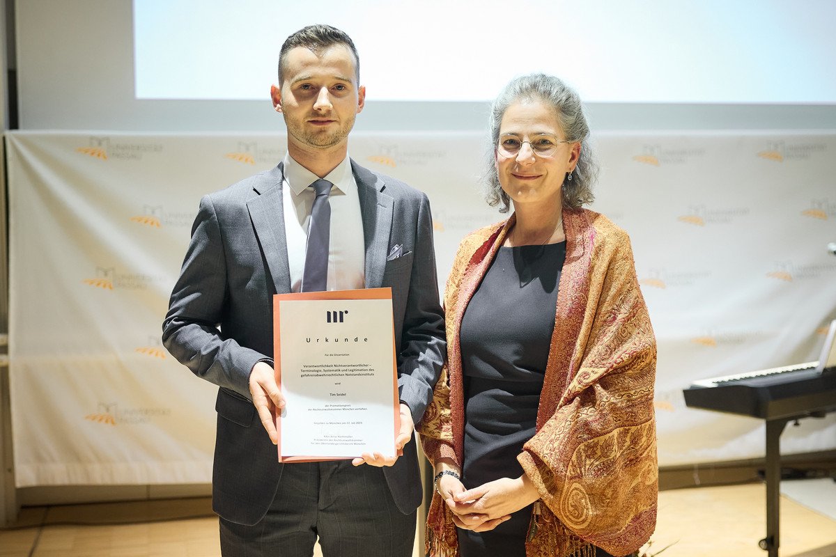 Im Rahmen der Promotionsfeier wurden zudem Doktorandinnen und Doktoranden der Juristischen Fakultät geehrt. Dr. Tim Kerstges und Dr. Tim Seidel erhielten den Promotionspreis der Rechtsanwaltskammer München aus den Händen von Präsidentin Anne Riethmüller. Eine Auszeichnung für Ihre Arbeiten durch den Verein der Freunde und Förderer der Rechtswissenschaft an der Universität Passau e. V. erhielten zudem Daniel Bäuml, Dominik Hübsch, Marie-Katrin Schaich, Gerhard Schranner, Nicola Schroth, Tim Seidel, Veronika Weigl und Kathrin Zitzelsberger für ihre Abschlüsse mit der Bestnote summa cum laude. Auch der Dekan fand für diese herausragenden Leistungen lobende Worte: