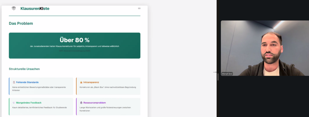 Auf Einladung der Professur für Rechtsinformatik insb. Natural Language Processing waren Herr Menaf Erol (CEO und Gründer von KlausurenKIste) sowie Herr Ilja Garber (CTO und Co-Gründer des Portals) am 17. November 2025 online zu Besuch an der Professur. Der Vortrag ergänzte die Themen der beiden Lehrveranstaltungen Information Retrieval & Natural Language Processing sowie Benutzeroberflächen aus praktischer Sicht.