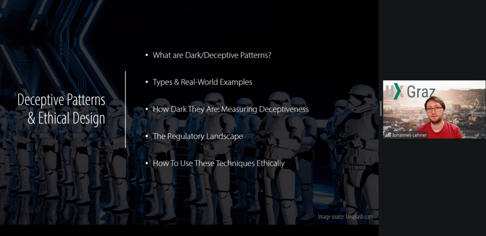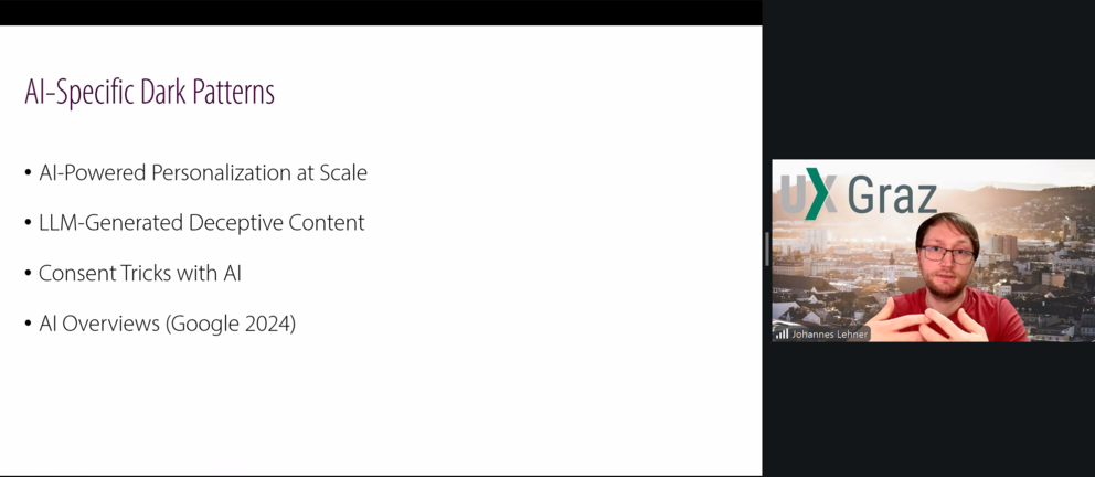 Herr Lehner beleuchtete dabei unter anderem die Auswirkungen von Pattern-Typen wie dem Confirmshaming, das Roach Motel oder dem Privacy Zuckering auf die Benutzerinnen und Benutzer von digitalen Benutzeroberflächen und deren Nutzungserlebnis (engl. User Experience). Zudem erörterte er mit den Studierenden, wie der Grad eines Dark Patterns evaluiert werden kann, warum die Berücksichtigung ethischer Grundsätze bei der Gestaltung von digitalen Benutzeroberflächen wichtig ist und welche Rolle ethische Design Scorecards beim Entwurf dieser einnehmen.
